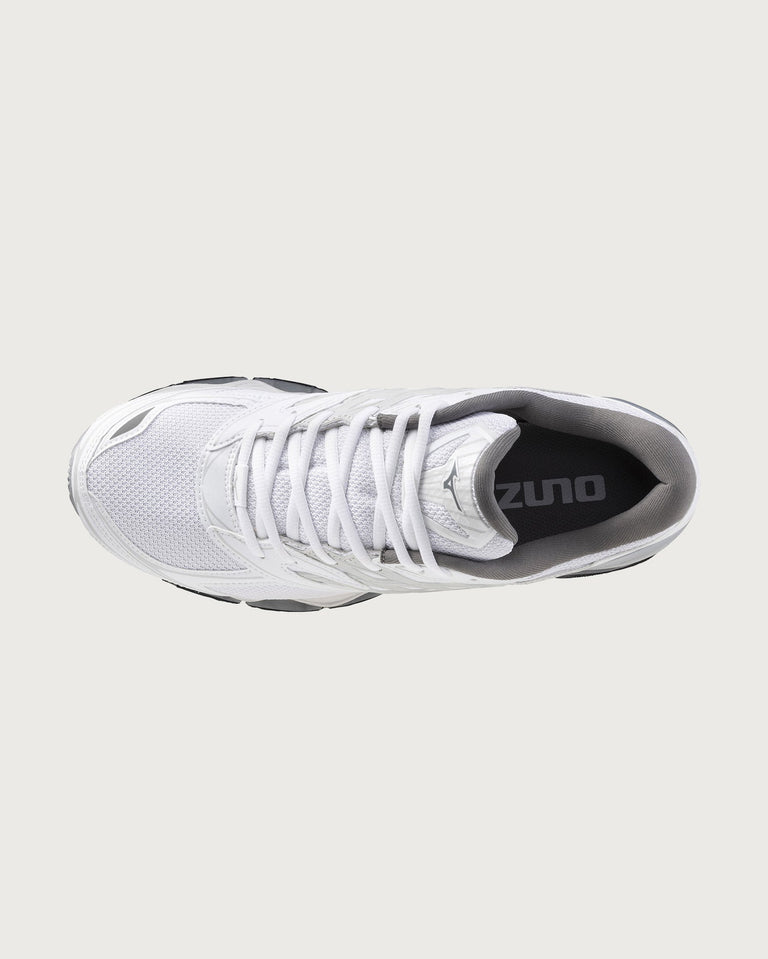 Zapatillas plateadas Wave Mujin TL GTX de la marca Mizuno. Para su colección Tech-Advance. Esta colección representa las siluetas más innovadoras, ilustrando las décadas de investigación y desarrollo de la división de calzado Mizuno.